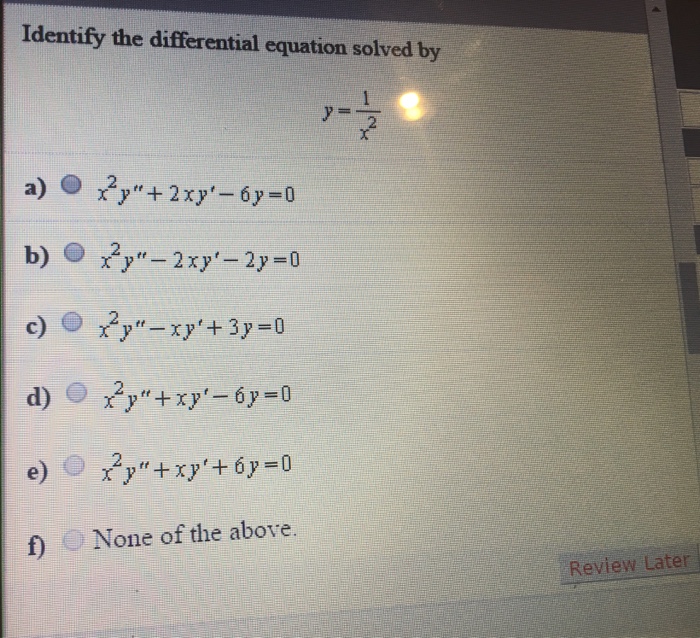 6 1 22 Find Power Series Solutions Of X 2 1 Y 6y 0 De Youtube (1x^2)y''2xy' 6y=0 (1x^2)y''2xy' 6y=0Integer solutions Implicit derivatives More;5 x2y02xy=1 (I =R) 62x(1Solve your math problems using our free math solver with stepbystep solutions Our math solver supports basic math, prealgebra, algebra, trigonometry, calculus and moreSolution 1 First assume y2=ux2, andy2'=2uxu'x2andy2''=u''x24u'x2u Substituting into x2y''2xy'6y=0 we getx2(u''x24u'x2u)2x(2uxu'x2)6y=0and simplifying by adding like